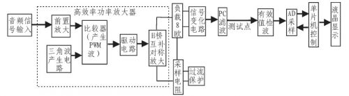 方案①:數(shù)字方案。輸入信號(hào)經(jīng)前置放大調(diào)理后,即由A/D采入單片機(jī)進(jìn)行處理,三角波產(chǎn)生及與音頻信號(hào)的比較均由軟件部分完成,然后由單片機(jī)輸出兩路完全反向的PWM波給入后級(jí)功率放大部分,進(jìn)行放大。此種方案硬件電路簡(jiǎn)單,但會(huì)引入較大數(shù)字噪聲。