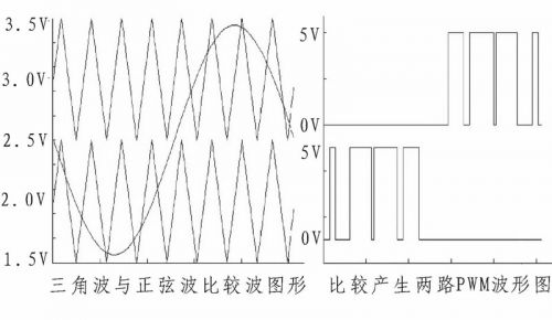 雙路比較器電路采用低功耗、可單電源工作的雙路比較器芯片LM393構(gòu)成。此處為提高系統(tǒng)效率,減少后級(jí)H橋中CMOS管不必要的開合,用兩路偏置不同的三角波分別與音頻信號(hào)的上半部和下半部進(jìn)行比較,產(chǎn)生兩路相互對(duì)應(yīng)的PWM波信號(hào)給后級(jí)驅(qū)動(dòng)電路進(jìn)行處理,雙路比較波形圖如圖3所示。此處值得注意的是將上半部比較處理為音頻信號(hào)接比較器的負(fù)向端、三角波信號(hào)接正向端;下半部比較則相反,這樣形成相互對(duì)應(yīng),在音頻信號(hào)的半部形成相應(yīng)PWM波時(shí),另半部為低電平,可保征后級(jí)H橋中的CMOS管沒有不必要的開合,以減少系統(tǒng)功率損耗。利用電位器將上半部比較三角波偏置調(diào)至3 V,下半部比較三角波偏置調(diào)至2 V.還需注意,三角波信號(hào)應(yīng)比需比較范圍內(nèi)的音頻信號(hào)幅度稍大一些,且偏置調(diào)節(jié)要較準(zhǔn)確,以防音頻信號(hào)某些點(diǎn)比較不到,后續(xù)濾波還原原信號(hào)時(shí)產(chǎn)生失真。