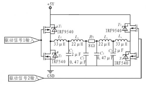 H橋互補(bǔ)對(duì)稱電路如圖4.采用低導(dǎo)通電阻、開關(guān)速率快、受溫度影響小的場(chǎng)效應(yīng)對(duì)管IRF9540和IRF540組成互補(bǔ)推挽放大電路。運(yùn)用對(duì)稱輸出方式,充分利用電源電壓,浮動(dòng)輸出載波峰峰值量大可達(dá)10 V,有效地提高了輸出功率。