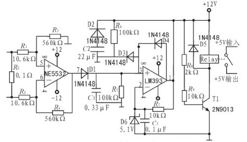 經(jīng)過放大后的信號(hào)經(jīng)過由D1、C1、R5組成的峰值檢波部分,檢出信號(hào)幅度值送至比較器與設(shè)定的基準(zhǔn)電壓進(jìn)行比較。比較器選用低功耗、響應(yīng)速度較快的雙路比較芯片LM393.比較器負(fù)端用穩(wěn)壓管D6及C3、R7設(shè)置為5.1V,比較器接成遲滯比較方式,一旦過流,即可自鎖。此時(shí)比較器輸出的高電平使三極管T1導(dǎo)通,繼電器的地控制端與地聯(lián)通,繼電器吸合,切斷功放部分的供電,達(dá)到保護(hù)目的。因比較器自鎖,所以在解決過流問題后,關(guān)斷保護(hù)模塊的電源,才能重新進(jìn)入保護(hù)狀態(tài)。D2、D3、R6、C2組成開機(jī)延時(shí)電路,在斷電后,C2通過D2快速放電,防止開始瞬間C2上的殘余電壓對(duì)3號(hào)腳影響,防止比較器在非正常狀態(tài)下進(jìn)入自鎖狀態(tài),使保護(hù)模塊不能發(fā)揮正常作用。