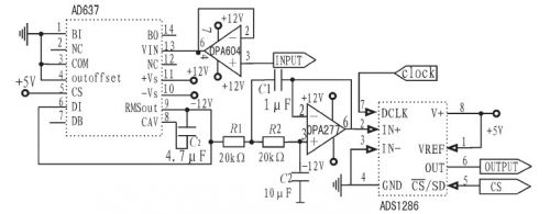 輸入綴用OPA604構(gòu)成一射極跟隨器已達(dá)到隔離前后級(jí)的作用。改變平均電容的值可設(shè)定平均時(shí)間常數(shù),并決定低頻準(zhǔn)確度、輸出波紋的大小和穩(wěn)定時(shí)間。交流波紋分量可以用增大此電容的值來減少,但這樣會(huì)使建立時(shí)間增大,所以選擇用后接一個(gè)二階有源低通濾波器的方法來減少輸出的紋波。得出真有效值后直接給入ADS1286進(jìn)行模數(shù)轉(zhuǎn)換,再由FPGA處理,計(jì)算出系統(tǒng)的輸出功率并進(jìn)行顯示。
