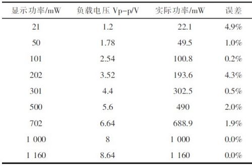 1)功率顯示誤差測(cè)量用Agilent信號(hào)源給出輸入音頻信號(hào),示波器在單端輸出測(cè)試點(diǎn)測(cè)負(fù)載上電壓峰值Vo,據(jù)式計(jì)算出實(shí)際功率,進(jìn)而計(jì)算出顯示誤差,結(jié)果見表1所示。