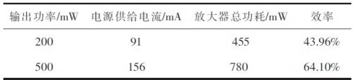 3)效率測(cè)量 用直流電源對(duì)功放電路單獨(dú)供電,以便測(cè)試效率。供電電壓+5 V.用與測(cè)通頻帶相同的方法給出給出輸入信號(hào),用示波器觀察輸出信號(hào)幅值,調(diào)整輸出為200 mW及500 mW,將四位半數(shù)字多用表串入放大器電路中,測(cè)出電路電流I.根據(jù)式計(jì)算出功率放大器效率,結(jié)果見表2所示。