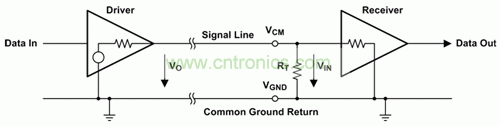 單端數(shù)據(jù)傳輸僅使用一條信號線,其電勢被看作接地。當(dāng)信號線為信號電流提供正向通道時,接地線會提供回流通道。圖 1 顯示了單端傳輸通道的基本示意圖。