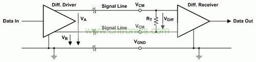 差動信號傳輸采用由兩條導(dǎo)線組成的信號線對:一條用于使電流正向流動,另一條用于使電流回流。每條信號導(dǎo)線都具有一個共模電壓 VCM,該電壓與 50% 的差動驅(qū)動器輸出電壓 VOD 相疊加,但彼此極性相反(請參見圖 2)。