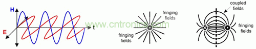 圖 3 從單導(dǎo)線周圍的大散射磁場和差動信號線對緊耦合導(dǎo)線回路之外的小散射磁場輻射出的 TEM 波