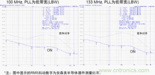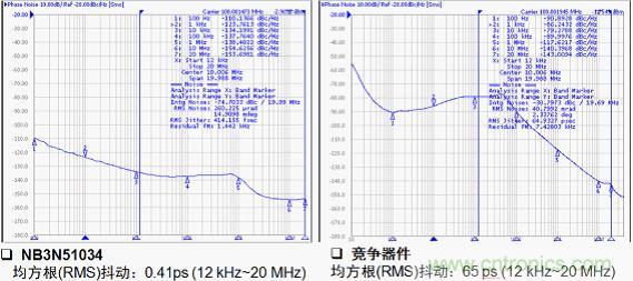 圖4:安森美半導體NB3N51034均方根抖動性能明顯優于競爭器件