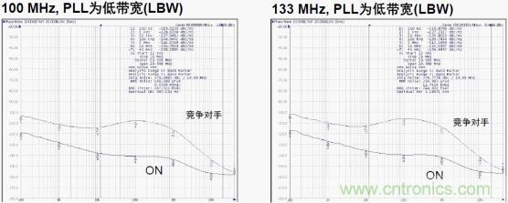 例如,NB3N1200K/NB3W1200L零延遲緩沖器(ZDB)帶12路HCSL/NMOS推挽輸出,特性包括:支持DIF SRC時鐘;12個差分時鐘輸出對@0.7V (NB3N1200K) ;12個低功耗NMOS推挽輸出對(NB3W1200L) ;針對100MHz和133 MHz優化,符合PCIe 第2代/第3代和英特爾QPI相位抖動規范;符合低EMI擴頻;最低輸入至輸出延遲變化的偽外部固定反饋;每12個輸出的單獨OE控制引腳。兩者的相位噪聲均優于競爭對手,見圖5。