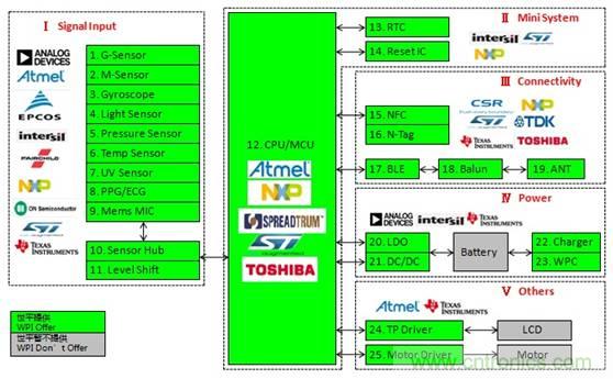①采用集成了符合低功耗的Bluetooth 4.0,以及傳感器和處理器,專門應用于穿戴式裝置的Toshiba TZ1001;