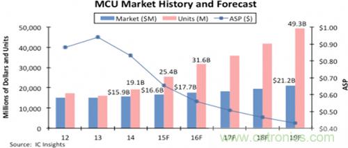 盡管將來的ASP還會(huì)繼續(xù)下滑,IC Insights預(yù)測明年的微控制器收會(huì)增長7%至177億美元,全球的出貨量會(huì)增長25%至316億顆。