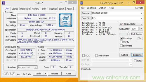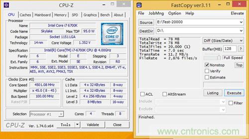 最后我們再來看看CPU頻率對SSD讀寫4KB小文件的速率影響,測試僅以四核1.6GHz和4.5GHz兩種配置成績對比,并開啟CPU超線程技術。為避免性能瓶頸,測試以浦科特M6V SATA 6Gbps SSD作為基準,與三星M.2 SSD 950 PRO互相拷貝4KB小文件,使用Fastcopy記錄讀寫時間和讀寫速率。(測試文件包包含20000個4KB TXT文檔)
