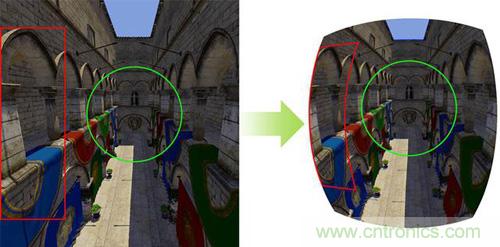 此外,作為VR領域不可或缺的技術之一,眼球追蹤技術還可以解決VR圖形畸變的問題。圖形畸變,同樣也是造成使用者眩暈的因素之一。通過上圖,我們可以看到,左邊就是普通的游戲畫面,而右邊,就是VR設備里所呈現的畫面。由于圖像畸變的原因,VR設備所呈現的畫面中,圖像的邊緣已經發生了明顯的畸變。即使Oculus曾在此問題上投入了大量的研發成本并應用反畸變算法優化了VR設備的成像,離開了眼球追蹤技術,圖像邊緣的畸變依然無法完美地解決。