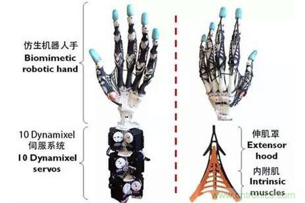 「擬人機器手設(shè)計的常規(guī)方法是,用類似鉸鏈、聯(lián)動裝置和平衡環(huán)等零件來實現(xiàn)生物部件的機械化,從而將看似復雜的人體參照物進行了簡化。這種方法對于理解并模仿人手的運動原理有一定幫助,但不可避免的制造了一些人與機械手之間的不良差異,因為人手上大多數(shù)顯著的生物力學特征都在機械化的過程中被丟棄了。這些機器手和人手生物力學在本質(zhì)上的不匹配阻礙了我們使用自然的手部運動來直接控制它們。因此,還沒有任何一只擬人機器人手可以達到人手的靈巧程度。」