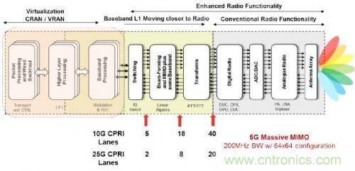 對于 6GHz 以下的部署,5G 系統(tǒng)通常多達 64 個天線單元。6GHz 以上可有更多的天線單元數(shù)量。數(shù)字波束形成一般用在 6GHz 頻率以下的情況(在基帶中實現(xiàn));而結(jié)合了數(shù)字和模擬波束形成技術(shù)的混合方案則用于 6GHz 以上頻率。包含 64 個天線單元的 Massive MIMO 系統(tǒng)配置會顯著增加復(fù)雜性和成本,因為要支持 L1 基帶中數(shù)字波束形成所需的大量有源無線電信號鏈和預(yù)編碼計算。基帶處理信號鏈與遠(yuǎn)端射頻單元之間的連接要求急劇增加。為了比較經(jīng)濟地實現(xiàn)這些系統(tǒng),有必要在無線電中集成 L1 基帶信號處理或其中的一部分。未來的這種功能劃分可能導(dǎo)致網(wǎng)絡(luò)節(jié)點中 L1-L2 與無線電功能處在相同位置。圖 3 介紹了 64 個天線單元的 Massive MIMO 在不同系統(tǒng)功能邊界上的連接要求,凸顯了 L1 與無線電共址的必要性。