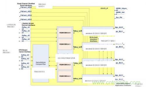 圖2中的STATS_IP架構模塊圖標出了三個子部件:每條通道的同地址比較管道(SACOMP)區(qū)塊、請求-復用-解復用(REQ_MXDMX_CHn)區(qū)塊以及每條QDR IV應用通道1個的4個A-B通道配對計數器邏輯(ABCH_CTRL_CHn)區(qū)塊實例。