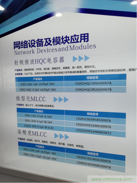 在展區,宇陽科技展示了各種應用的電容,如網路設備及模塊應用射頻微波HQC電容器、手機應用中超微型MLCC、用于安防產品高溫型MLCC、用于汽車電子應用中的高容MLCC等。