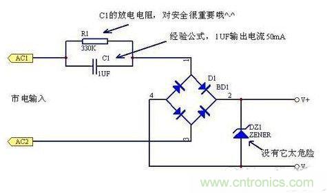 電容降壓式電源是一種非隔離電源,在應用上要特別注意隔離,防止觸電