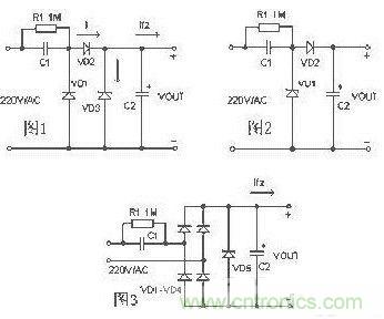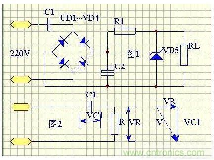 如圖-1,C1 為降壓電容器,D2 為半波整流二極管,D1 在市電的負半周時給C1 提供放電