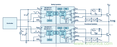 圖6. 采用ADuM4121隔離式柵極驅(qū)動器的半橋設(shè)置中的隔離柵