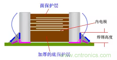 由于保護層厚度部分是沒有內電極的,這部分的BaTiO3陶瓷不會發生形變,當兩端的焊錫高度不超過底保護層厚度,這時產生的形變對PCB影響要小,有效地降低噪聲。