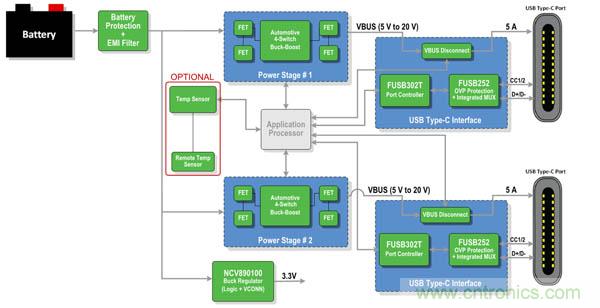 這顯示了控制器和主機(jī)處理器之間的I2C接口,說明FUSB302B沒有集成自己的處理器。這是該器件的一個(gè)重要特性,因?yàn)樗鼰o需為一個(gè)集成的處理器提供額外功率,同時(shí)支持固件駐留在位于系統(tǒng)任意處的處理器中,如果USB規(guī)范被修改,為制造商提供一個(gè)更簡單的升級(jí)路徑。圖2顯示了一個(gè)更詳細(xì)的應(yīng)用示例。FUSB302T是FUSB302B的默認(rèn)源配置選項(xiàng),可用作在汽車應(yīng)用中實(shí)施USB Type-C時(shí)構(gòu)成完整系統(tǒng)的一部分。