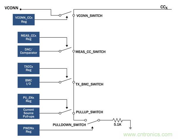 FUSB302B實(shí)施了一個(gè)CC開關(guān),使它能夠檢測到它是作為設(shè)備主機(jī)還是雙角色端口連接,通過多個(gè)比較器和由主機(jī)處理器上的軟件控制的可編程DAC進(jìn)行管理(圖3)。