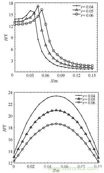 1)線圈產生的磁場強度在徑向上由線圈半徑附近向兩端衰減,縱向上線圈上下兩端處磁場強度有最大值。