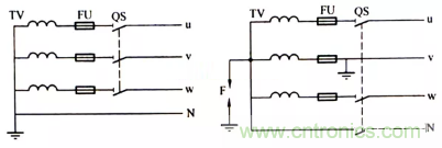 圖6:電壓互感器二次側的接地方式    說明:圖6(a)中性點接地;圖6(b)v相接地
