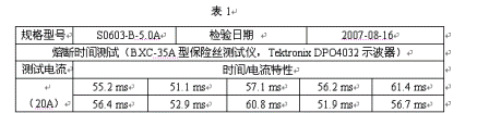1.測試S0603-B-5.0A保險絲在20A熔斷時間如下表1