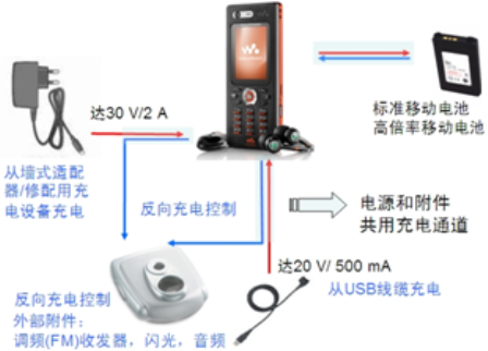 我們把普通墻式適配器或USB充電適配器到移動設(shè)備電池的通道稱為直接充電通道,而把移動設(shè)備電池到外部附件(如調(diào)頻收發(fā)器、負(fù)載揚(yáng)聲器和閃光模塊)的通道稱為反向供電/充電通道(參見圖1移動設(shè)備的直接充電通道和反向供電/充電通道示意圖)。