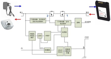 移動設(shè)備的直接充電通道面臨著浪涌電流效應(yīng)和正/負(fù)向過壓等風(fēng)險。適配器熱插入的瞬間,由于線纜的寄生電感和輸入電容的緣故,危險的高壓振鈴可能會損害移動設(shè)備中敏感的集成電路(IC)。在這方面,設(shè)想的移動設(shè)備保護(hù)方案應(yīng)可通過控制保護(hù)方案內(nèi)的MOSFET的導(dǎo)通,使移動設(shè)備輸入電流和輸入電壓不超過IC所能承受的電壓值,從而保護(hù)移動設(shè)備免于源自各種應(yīng)用環(huán)境下可能存在的過壓故障的損害,如由適配器內(nèi)部故障產(chǎn)生的正向過壓、適配器插反產(chǎn)生的負(fù)向過壓等。