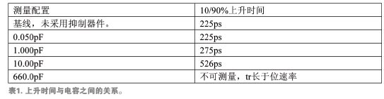 上升和下降時間較慢會給系統(tǒng)帶來一些問題,其中最重要的是時序問題。電路在特定的時間需要穩(wěn)定的“高”態(tài)和“低”態(tài)。隨著各狀態(tài)之間過渡時間的增加,電路有可能檢測到不完整的過渡期,從而將數(shù)據(jù)誤差引入系統(tǒng)。表1是不同寄生電容ESD抑制器件對數(shù)據(jù)上升沿時間(10%至90%高電平)所造成的影響比較。