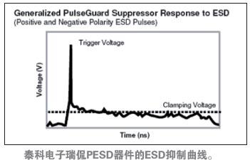 圖3.泰科電子瑞侃PESD器件的ESD抑制曲線。