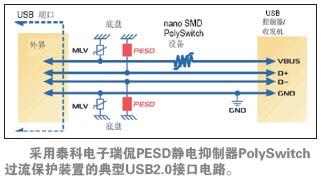 圖7.采用泰科電子瑞侃PESD靜電抑制器和PolySwitch過流保護(hù)裝置的典型USB2.0接口電路。
