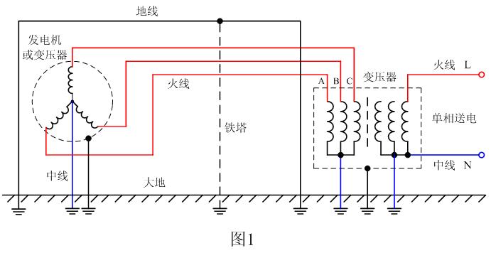 在圖1中,紅線A、B、C表示高壓輸送線路,高壓輸送線路一般都用鐵塔空架支撐,用以對幾十萬伏的交流電進(jìn)行遠(yuǎn)距離傳送,這樣,其經(jīng)常受雷擊是不可避免的;為了避免雷擊,一般都在高壓線路的上方平行架設(shè)一條地線,這條地線一般稱為避雷地線。所謂地線就是與大地相連的導(dǎo)線,當(dāng)打雷的時候,雷電首先會打到避雷地線上,避雷地線可把雷電引入地球,避免高壓輸送線路被幾億伏,乃至十幾億伏的雷電把發(fā)電機(jī)或變壓器的線圈與外殼擊穿,以及把與線路連接的其它電器設(shè)備遭受瞬間高壓沖擊而損壞。因此,圖1中的避雷地線與一般電子線路中的地線完全是兩回事。