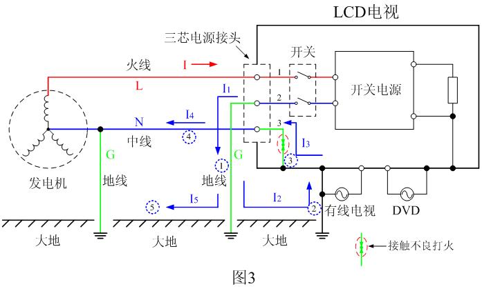 但電流I1沒有按圖2中的正常路線直接經(jīng)中線返回發(fā)電機(jī),而是經(jīng)地線(1)流入大地,然后電流I1在大地中被分成兩路I2和I5 ,I5直接通過大地(5)返回發(fā)電機(jī);而I2則通過大地與電視機(jī)的其它地線(2)(比如有線電視信號線或與電視機(jī)連接的其它設(shè)備連線)流回到電視機(jī)的外殼一端,I2電流經(jīng)過有線電視信號線接口(僅舉其中之一)后變?yōu)殡娏鱅3;I3再經(jīng)電視機(jī)內(nèi)的地線(3)以及電視機(jī)的三芯插頭3號線接頭,從三芯插頭3號線接頭流出,流出電流變成I4,電流I4再經(jīng)中線(4)流回發(fā)電機(jī)。