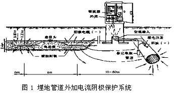 傳統的管道防腐方法是在管道上涂上油漆或纏繞復合材料作為防腐絕緣層,采用這種方式防腐的管道因防腐層容易脫落和易受腐蝕,故其使用壽命短,施工繁瑣,防腐效果差。現代的管道防腐一般采用電化學原理,實行陰極保護的方法,向被保護金屬管道通入合適的直流電,使其對于陽極接地裝置變成一個大陰極,對保護管道形成保護電位,從而使腐蝕降低到最低限度,進而延長管道的使用壽命。