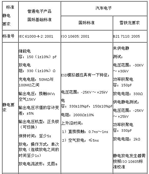 靜電問題對電子設備來說是必須考慮和預防的。為了防止電子設備在靜電干擾時出現產生不必要的誤動作,因此各個國家、各行業也都對于相關的電子設備做出了靜電測試(ESD)要求。本文就以普通電子產品的國際基礎標準要求與汽車電子的國際標準(以雪鐵龍企業標準為例)做一比較。