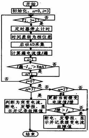 漏電流檢測的流程圖如圖3所示。漏電流信號過零點后,開始AD采樣轉換,根據定時器測得漏電流和工作電壓之間的時間差計算相位差,得到漏電流的大小,將連續3個周期同一時刻的值分別與突變電流和緩變電流的設定值作比較,判斷當前是否發生漏電;若漏電,漏電由緩變電流引起還是突變電流引起;若大于整定值則立刻斷電并顯示系統當前故障值并報警等。
