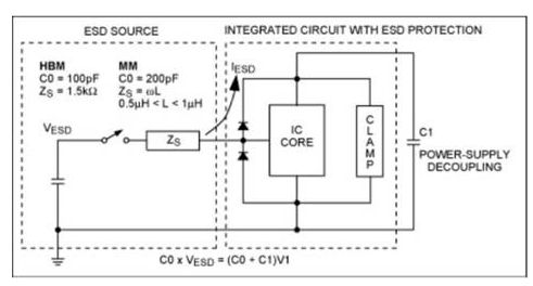 靜電放電強度以電壓形式表示,該電壓由電容的儲能電荷產生,最終傳遞到IC。作用到IC的電壓和電流強度與IC和ESD源之間的阻抗有關。對電荷來源進行評估后建立了ESD測試模型。
