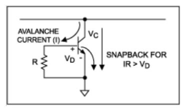雙極型IC的箝位電路類似于在受保護核電路中提供一個受沖擊時擊穿的部件,圖3給出了圖1中箝位功能的詳細電路。箝位晶體管的過壓導致集電極-基極之間的雪崩電流,發射結的正向偏置會進一步提高集電極電流,導致一個“突變”過程。箝位時的V-I特性曲線如圖4所示。