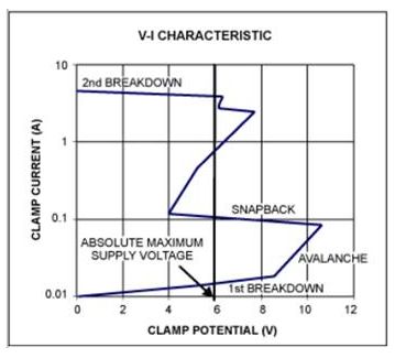 [page]箝位電壓從第一次擊穿變化到突變穩定后的導通電壓,如圖5所示。為保證箝位時關閉正常的工作條件,設計的箝位電壓一般要略高于IC的絕對最大電壓。