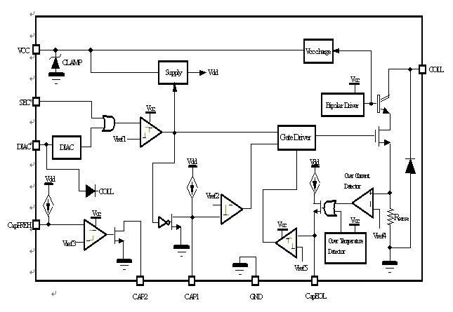 控制級和功率級都是由Vcc引腳供電,Vcc引腳通過一個電阻電容(R-C)網絡與直流總線相連。在啟動階段,電容通過一個高阻值的電阻器充電,因此,只需幾百微安。由于功率雙極晶體貯存基極電流是在通過‘Vcc充電網絡’連接Vcc引腳的電容上恢復的,因此,在工作階段,器件是自己給自己供電。