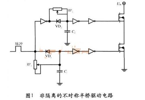 圖1為常用的小功率驅動電路,簡單可靠成本低,適用于不要求隔離的小功率開關設備。其中一路直接接到下管,另外一路經反向器反向后驅動上管。RP1,RP2用于調節死區時間。
