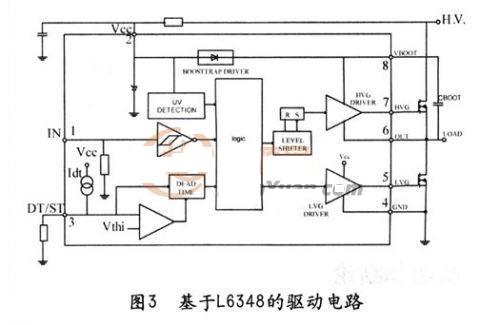 ST公司的L6384是專門的不對稱半橋驅動芯片,其原理圖及外圍電路如圖3所示。單脈沖從1腳(IN)輸入,5腳(HVG)和7腳(LVG)輸出互補的脈沖。3腳(DT/ST)外接電阻和電容來控制兩路輸出的死區時間。當3腳的電平低于0.5V的時候,芯片停止工作。專用芯片具有外圍電路簡單、占用空間小的特點,但由于其成本較高,不適用于低成本設計的產品