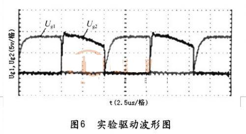 本文設計了一臺不對稱半橋變換器樣機:工作頻率為98kHz,輸人電壓為400VDC,輸出電壓為30VDC。測得占空比為0.47時的驅動波形Ug1,Ug1如圖(6)所示。