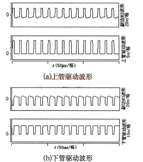 在SABER仿真下,該變壓器副邊N2,N3以及上、下管的驅動波形分別如圖5(a)、(b)所示。