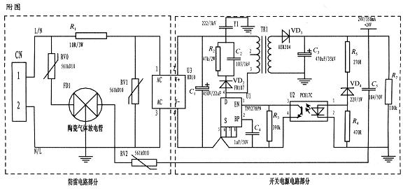 為了實(shí)現(xiàn)上述目的所采取的設(shè)計(jì)方案是:將壓敏電阻和陶瓷氣體放電管的單相并聯(lián)式抗雷擊浪涌電路應(yīng)用到儀表的電源上。主要分為防雷電路部分和開(kāi)關(guān)電源電路部分,電路簡(jiǎn)單,采用復(fù)合式對(duì)稱(chēng)電路,共模、差摸全保護(hù),可以不分L、N端連接。使壓敏電阻RV1位于貼片整流模塊前端分別與電源L、N并聯(lián),主要來(lái)鉗位L、N線間電壓,壓敏電阻RV0、RV2與陶瓷氣體放電管FD1串聯(lián)后接地,RV0與FD1串聯(lián)主要是泄放L線上感應(yīng)雷擊浪涌電流,RV2與FD1串聯(lián)主要是泄放由信號(hào)口串人24V參考電位上的能量,RV0、RV2短路失效后,F(xiàn)D1可將其與電源電路分離,不會(huì)導(dǎo)致失火現(xiàn)象。