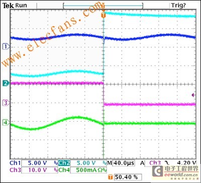 圖2的波形代表一個工作電路。放大器的輸出之一(上跟蹤,深藍色)是一個1kHz正弦波直流偏壓為2.5V。第二次跟蹤(青色)是線束上看到的信號。這也從一開始就是在2.5V直流偏置一個1kHz正弦波,但200μs是一個18V電源短路。第三次跟蹤(洋紅色)是分流穩壓器輸出,最初在11V的偏見,但拉回應過壓條件地面。第四次跟蹤(綠色)線束的電流。最初是一個正弦波,電流下降到零這個回應過壓條件。