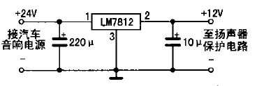 具體制作如下:先把功放輸出端與音箱的引線切斷,按圖2所示電路將引線頭a、b分別接功放的兩組輸出端,c、d分別接左、右聲道音箱:揚(yáng)聲器保護(hù)電路的電源只能從收放機(jī)中獲取,不可直接從汽車12 v電源中獲取,否則不起開(kāi)/關(guān)機(jī)保護(hù)作用;若是柴油車所配置的收放機(jī)(使用24 V電源),則要求增加一個(gè)降壓電路(見(jiàn)圖3所示),給揚(yáng)聲器保護(hù)電路供電,以免電源電壓過(guò)高損壞IC。